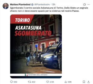 Di segno opposto la posizione del ministro dell’Interno Matteo Piantedosi, che su X, incisivo e sintetico, ha scritto: “Sgomberato il centro sociale Askatasuna di Torino. Dallo Stato un segnale chiaro: non ci deve essere spazio per la violenza nel nostro Paese”.