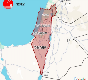 La cartina evidenzia in rosso l’intero territorio di Israele, apparendo come una striscia allungata, sottile e priva di profondità strategica tra il Mar Mediterraneo e i confini orientali. Questa forma geografica racconta una vulnerabilità strutturale: nel punto più sottile, tra la costa e la Cisgiordania, la distanza è minima e non esiste un vero spazio difensivo dove arretrare in caso di attacco.