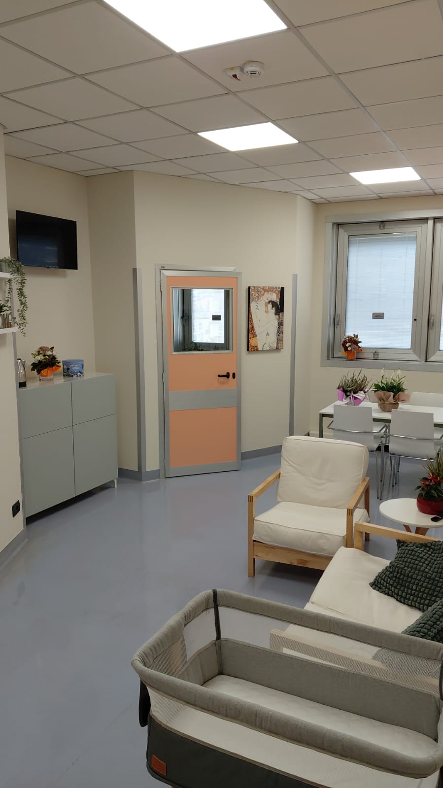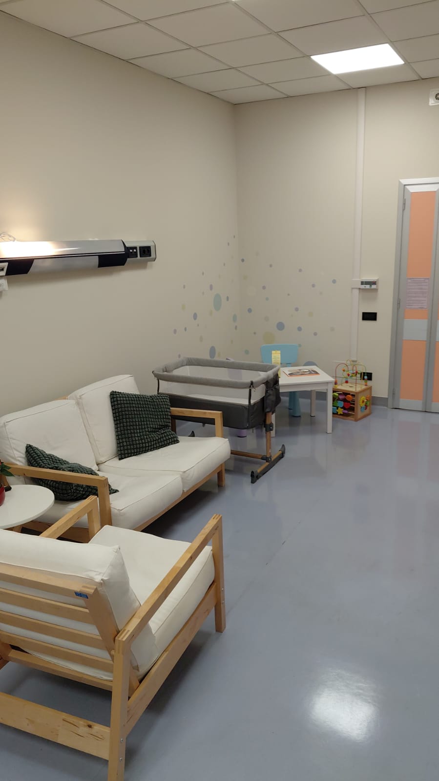 La Casa Parto non è una semplice stanza ospedaliera: è un vero e proprio miniappartamento, pensato per far sentire la donna e la sua famiglia in un contesto domestico. Una camera matrimoniale con culla, un salotto con area giochi per fratellini e sorelline, un bagno con doccia e un’isola neonatale: tutto curato nei dettagli, con arredi nuovi e funzionali, capaci di trasmettere serenità.